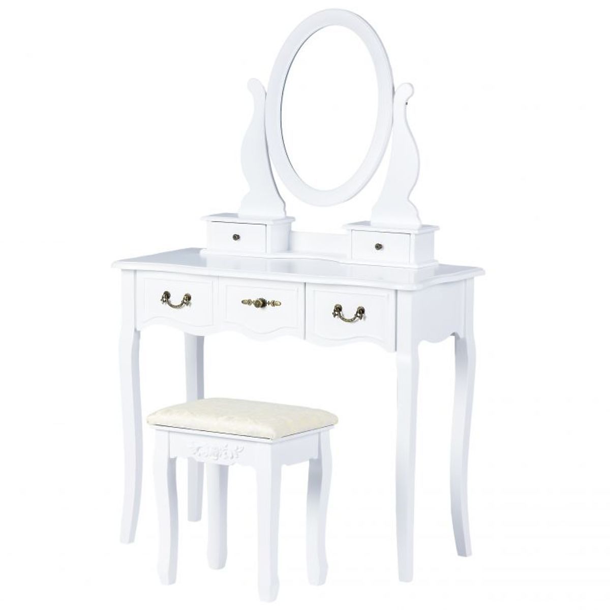 Der weiße Schminktisch Alva mit Spiegel ist eine elegante Aufbewahrung für Kosmetika, Schmuck und andere Accessoires. Dank des gepolsterten Hockers und fünf .. mehr