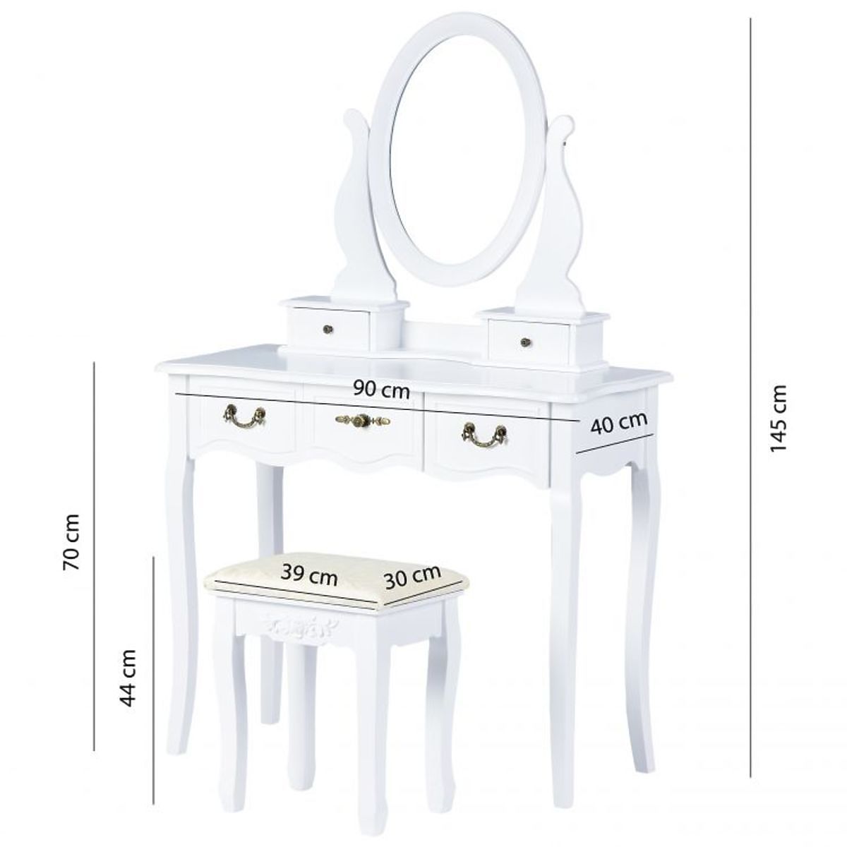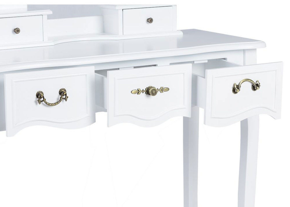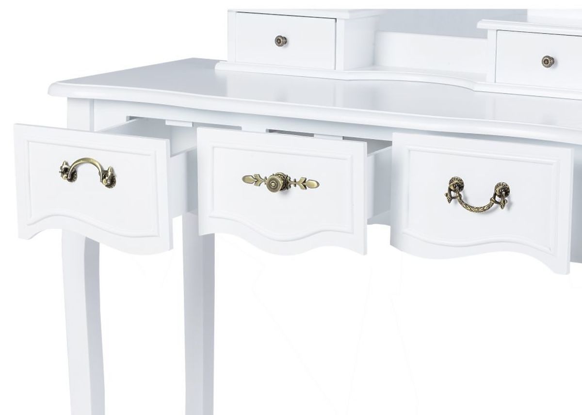Der weiße Schminktisch Alva mit Spiegel ist eine elegante Aufbewahrung für Kosmetika, Schmuck und andere Accessoires. Dank des gepolsterten Hockers und fünf geräumigen Schubladen wird Ihr Make-up zu einer sehr bequemen und stilvollen Angelegenheit.