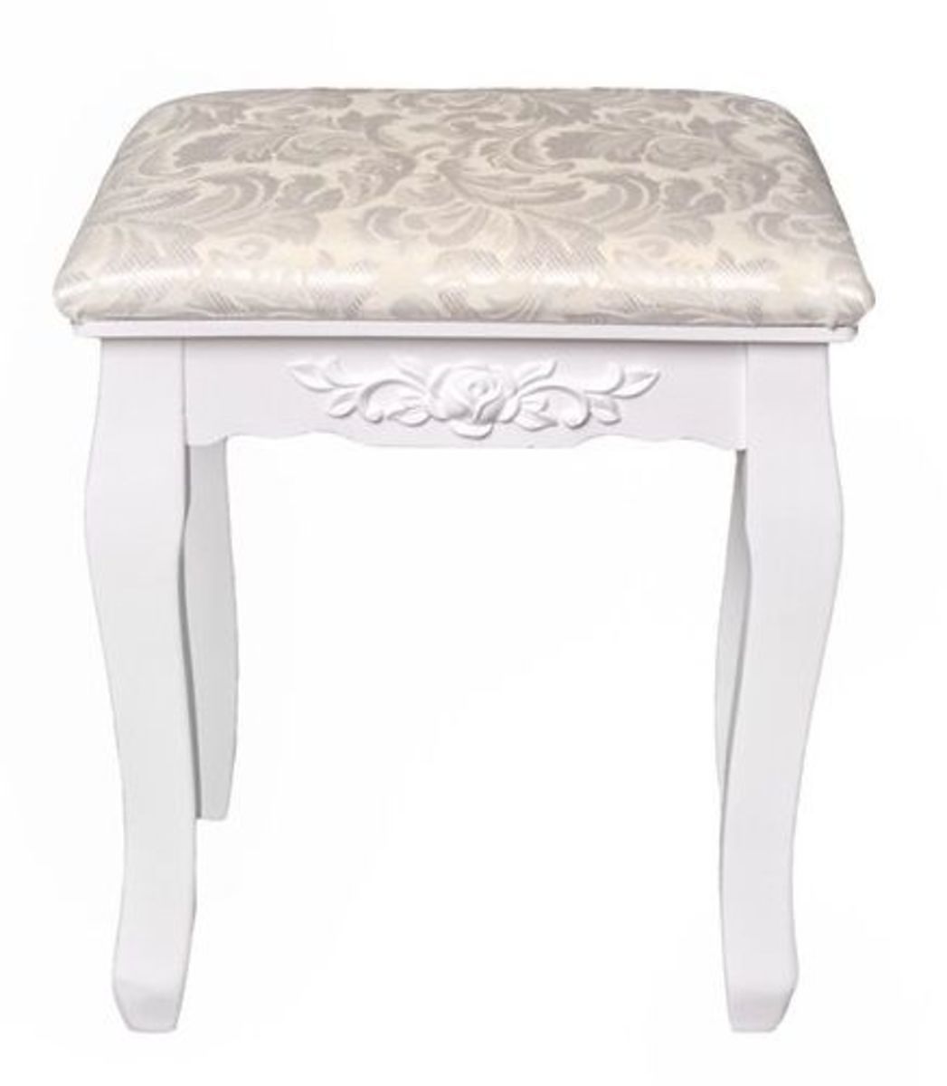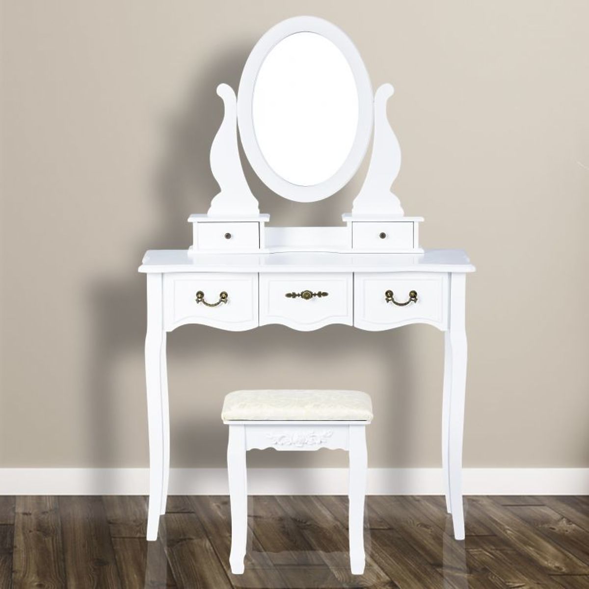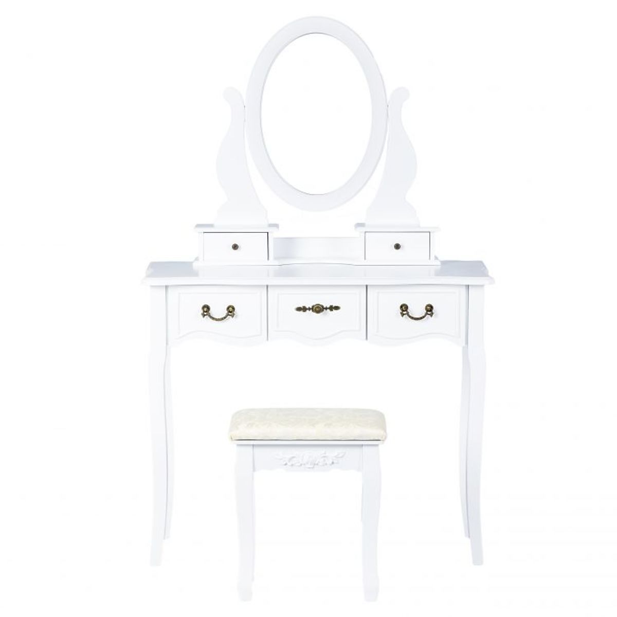 Der weiße Schminktisch Alva mit Spiegel ist eine elegante Aufbewahrung für Kosmetika, Schmuck und andere Accessoires. Dank des gepolsterten Hockers und fünf geräumigen Schubladen wird Ihr Make-up zu einer sehr bequemen und stilvollen Angelegenheit.