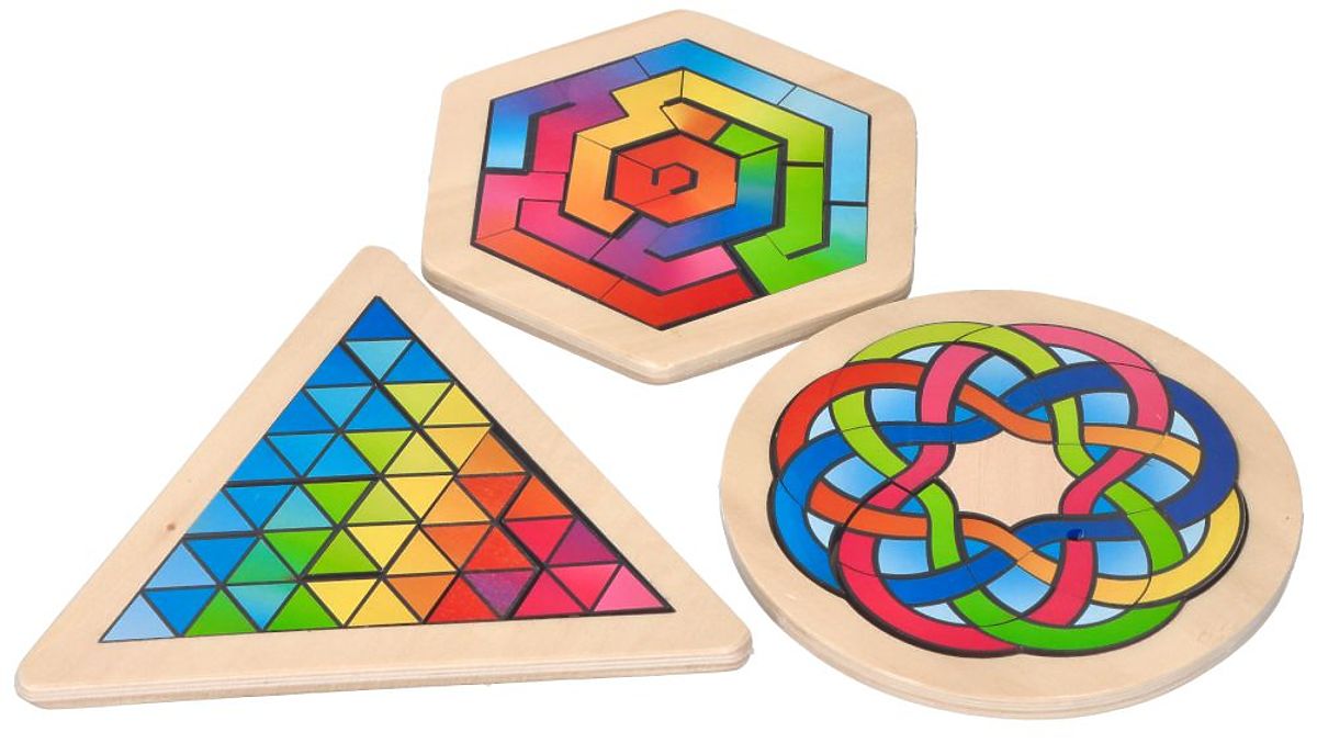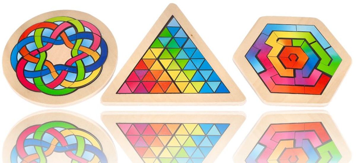 Die Puzzle-Serie Gehirntrainer bietet 3 elegante Puzzletypen, bei denen die Elemente so angeordnet werden müssen, dass sie ein Mosaik in Form und Farbe ergeben. Jedes von ihnen stellt jedoch ein anderes Muster dar und erfordert eine neue Bewertung der Puzzles: