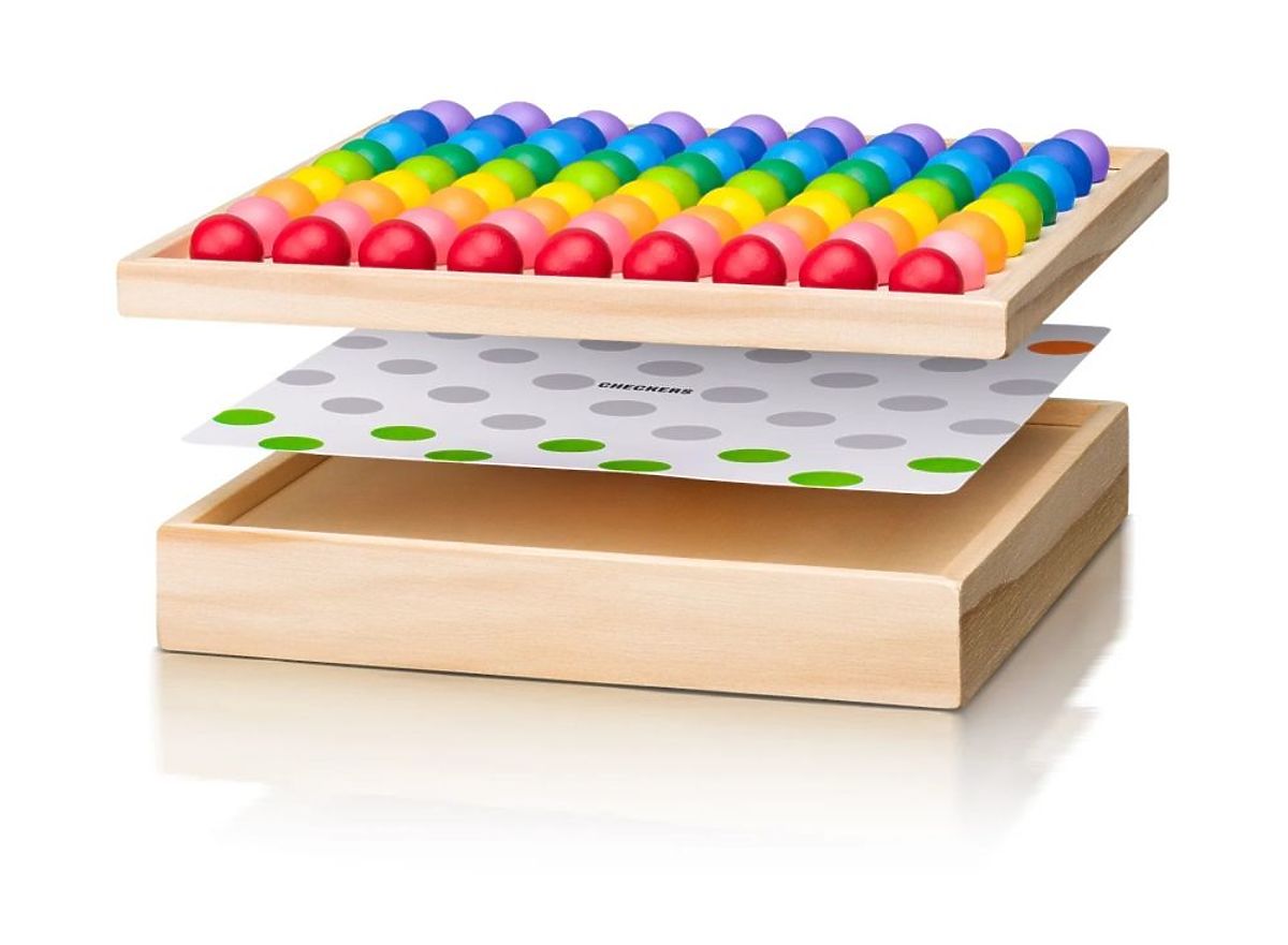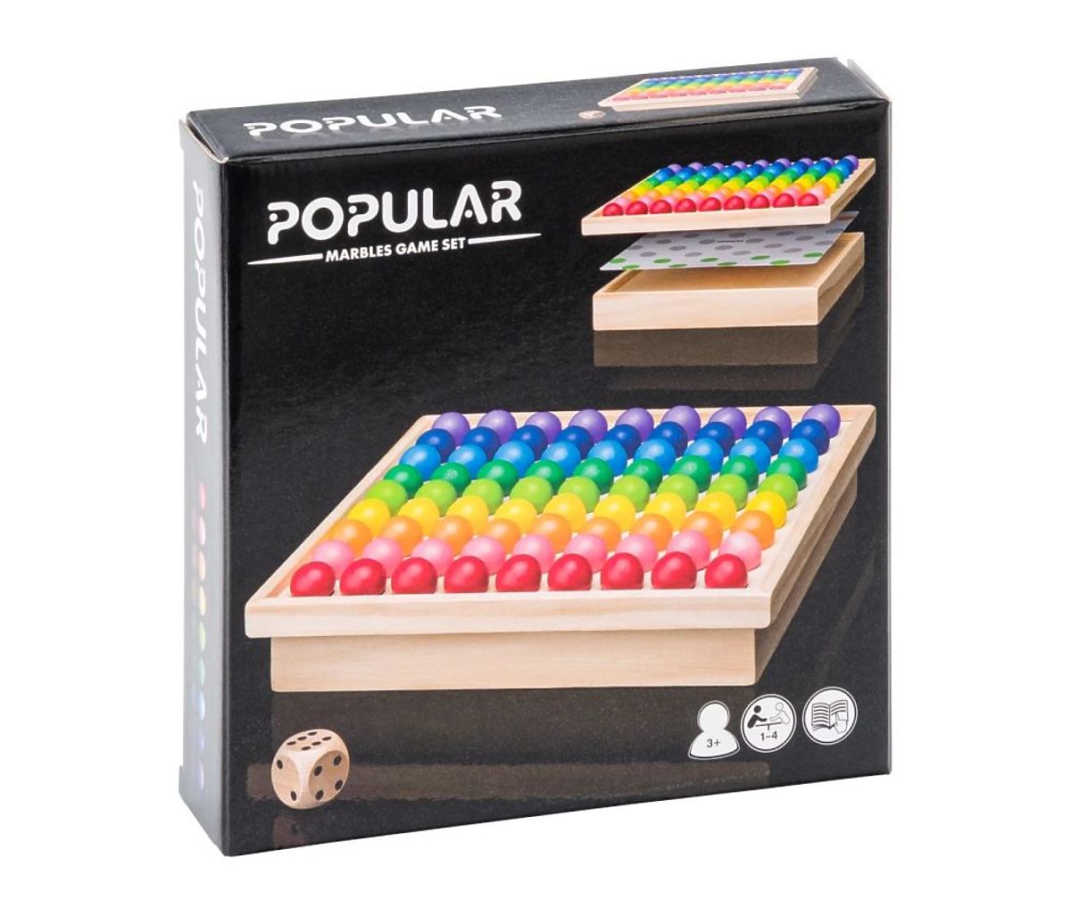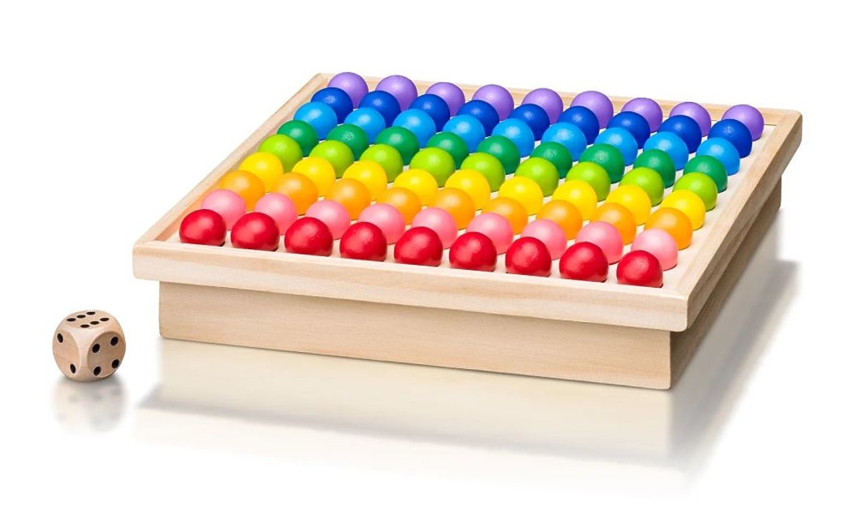 Ein multifunktionales Spieleset für die ganze Familie, bei dem jeder etwas für sich findet. Diese Holzkiste mit bunten Kugeln verbirgt bis zu 7 mögliche Spielszenarien, sowohl für Einzel- als auch für Gruppenspiele. Das Set besteht aus einer Holzkiste mit einem Deckel, der mit 81 Löchern versehen ist, in die die kleinen Kugeln (je 9 Stück in 9 Farben) perfekt passen. Zum Spiel gehören ein Holz-Würfel, eine Anleitung und 15 Schablonenkarten (zum Einlegen unter den gelochten Deckel, je nach Spielart).