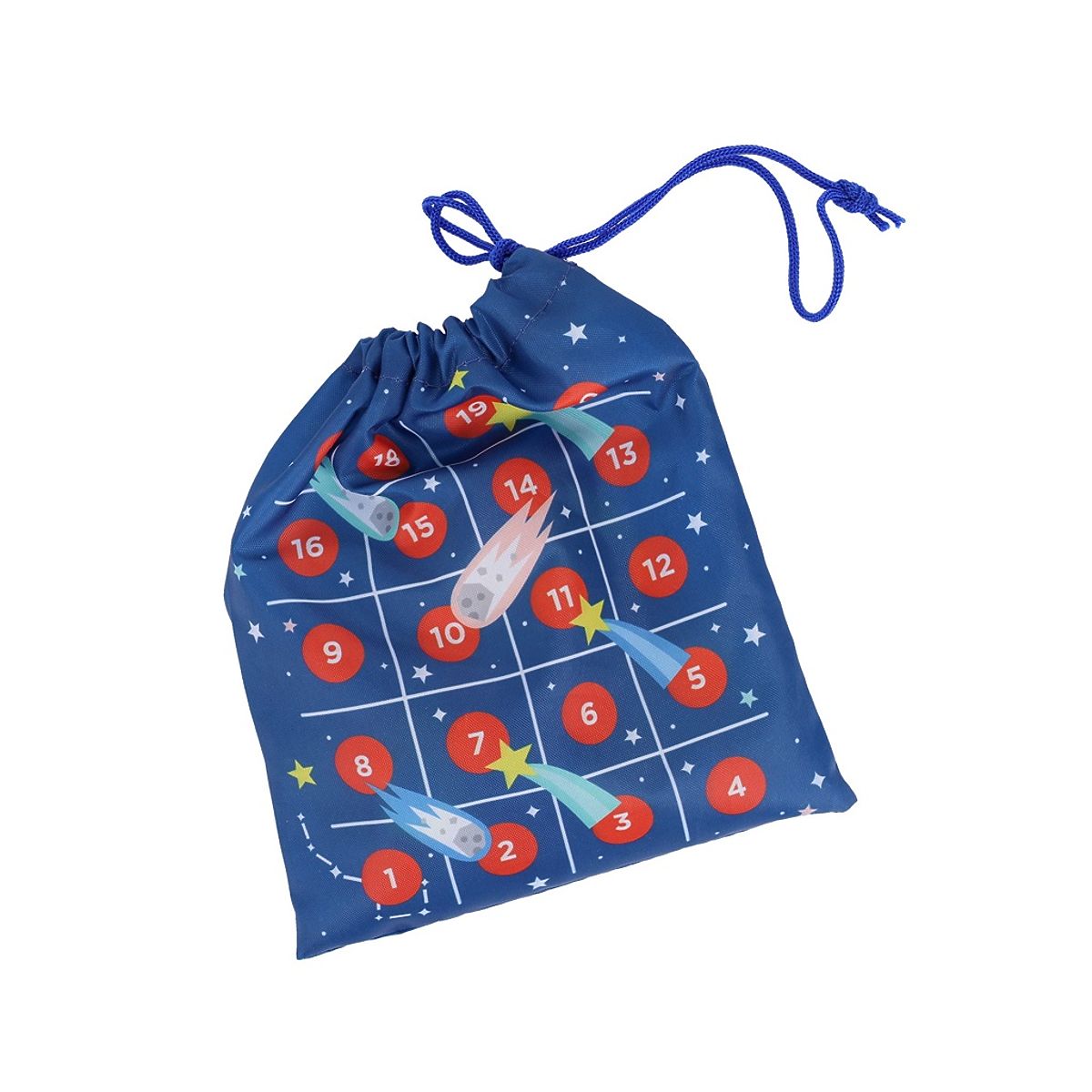 Bereisen Sie die Galaxie mit zwei beliebten Spielen! Das Reisespiel 2 in 1 Weltraumabenteuer ist eine Version der klassischen unterhaltsamen Spiele Tic-Tac-Toe und Schlangen und Leitern. Das Spiel enthält 10 Holzfiguren in Form von Raketen und Planeten, einen Würfel und eine Spielanleitung. Die Spieler bewegen Planeten und Raketen auf den Gittern, die auf einem praktischen Reisebeutel mit Kordelzug und Weltraummotiven aufgedruckt sind. Wenn ein Spieler auf einem Feld mit einem Kometenbild landet, steigt er eine Reihe höher, und ein Feld mit einem fallenden Meteoriten bringt ihn wieder eine Reihe tiefer. Die Spiele sind eine großartige Möglichkeit, Kindern Geduld, Konzentration, Kommunikation mit anderen Spielern, Gewinnen, aber auch Verlieren beizubringen. Für jüngere Kinder ist das Bewegen der Figuren auf dem Spielplan eine hervorragende Übung zur Hand-Augen-Koordination, Geschicklichkeit und zum Erkennen von Farben und Formen. Alle Spielbestandteile sind aus recycelten Materialien hergestellt. Der Stoffbeutel besteht aus recyceltem PET, die Kordel aus recyceltem PP und die Holzfiguren aus recyceltem Holz. Hauptmerkmale: 2 Spiele in praktischer ReiseverpackungVersionen der beliebten Spiele Tic-Tac-Toe und Schlangen und Leiternlehrt Geduld, Konzentration, Gewinnen und Verlierenfördert die Hand-Augen-Koordinationunterstützt das Erkennen von Farben und Formenfür 2 Spielergeeignet für Kinder ab 4 Jahren