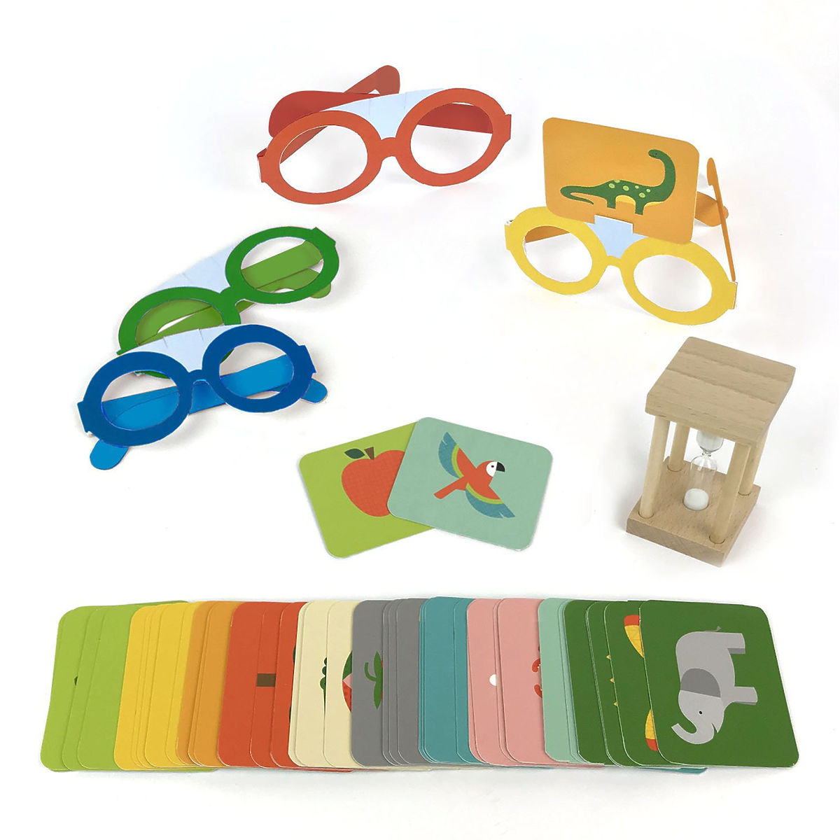 Bin ich ein Tier? Bin ich ein Objekt? Bin ich groß? Mache ich Geräusche? So viele Fragen, so wenig Zeit! Ein schnelles Spiel für die ganze Familie, das Ihnen viel Lachen und Spaß garantiert. Enthält 4 Brillen mit Kartenhalter, eine Sanduhr und 50 bunte Karten mit Bildern. Hauptmerkmale: Spiel für 2 bis 4 Spieler Durchschnittliche Spieldauer 15 Minuten Hergestellt aus recycelten Materialien, gedruckt mit Pflanzenfarben Von 4 bis 8 Jahren Erfüllt alle Sicherheitsstandards