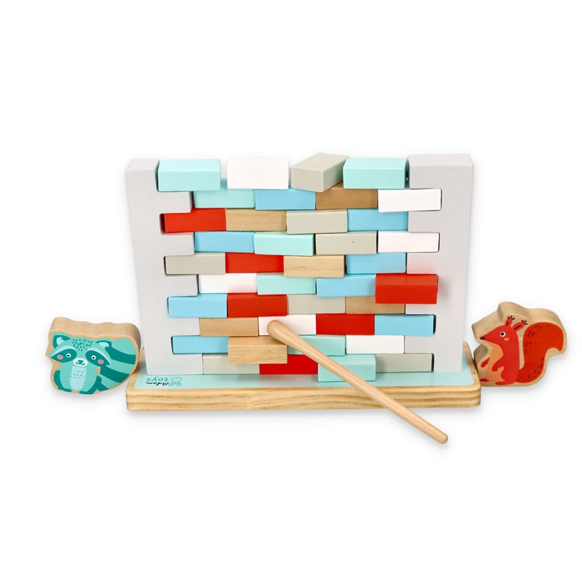 Das Spiel ist für eine beliebige Anzahl von Spielern geeignet, die abwechselnd Steine aus der gebauten Wand ziehen. Sie können dies mit der Hand oder dem beiliegenden Stäbchen tun. Wer das meiste Glück und Geschick hat, gewinnt. Die Person, die die Wand umwirft und damit das Tier herunterwirft, verliert.