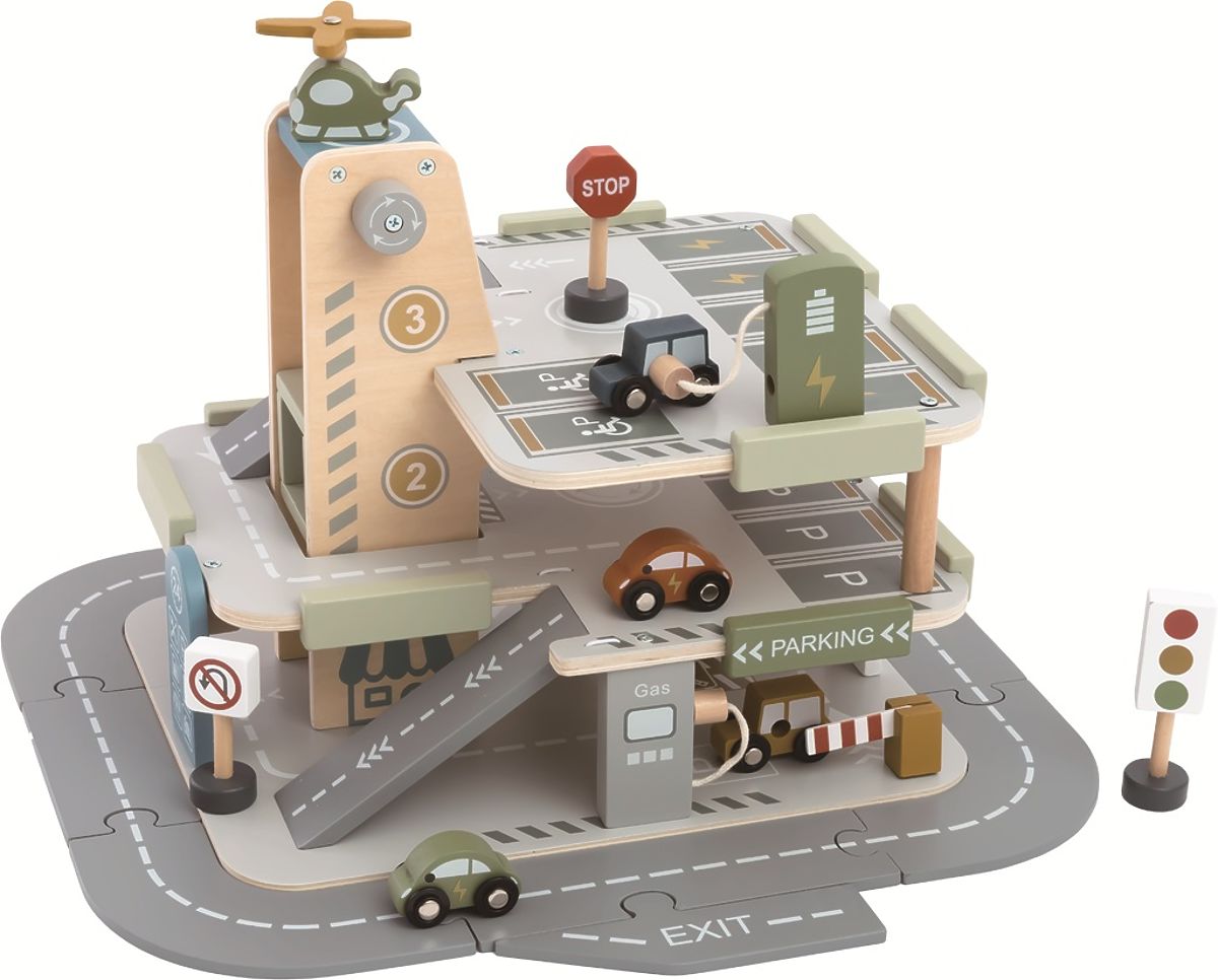 Alle Autofans werden strahlende Augen bekommen, wenn sie die Garage mit Straße, Aufzug und Hubschrauberlandeplatz sehen. Platzieren Sie die Verkehrsschilder, bereiten Sie Ihre Autos vor und das Spiel kann beginnen. Waschen Sie Ihr Fahrzeug in der Autowaschanlage. Tanken Sie Kraftstoff an der Zapfsäule im Erdgeschoss. Haben Sie ein Elektroauto? Kein Problem, bringen Sie Ihr Fahrzeug mit dem Aufzug nach oben und schließen Sie es an die Ladestation im zweiten Stock an. Ist die Batterie voll? Dann können Sie losfahren. Ein Unfall ist passiert? Vom Hubschrauberlandeplatz auf dem Dach startet bereits der Hubschrauber. Dieses lehrreiche Spielzeug motiviert Kinder zu kreativem und fantasievollem Spiel. Es fördert die Hand-Auge-Koordination, Feinmotorik und Geschicklichkeit. Die Garage mit Parkflächen auf drei Ebenen enthält auch eine Straße, 4 Autos, einen Hubschrauber und 3 Verkehrsschilder. Hauptmerkmale: 3 Etagen, Garage mit Straße, Hubschrauberlandeplatz und Aufzug, 4 Autos, Autowaschanlage, 2 Zapfsäulen (davon 1 Elektro), Hubschrauber, 3 Verkehrsschilder, inspiriert zu kreativem und fantasievollem Spiel, fördert die Hand-Auge-Koordination, Feinmotorik und Geschicklichkeit, geeignet für Kinder ab 3 Jahren