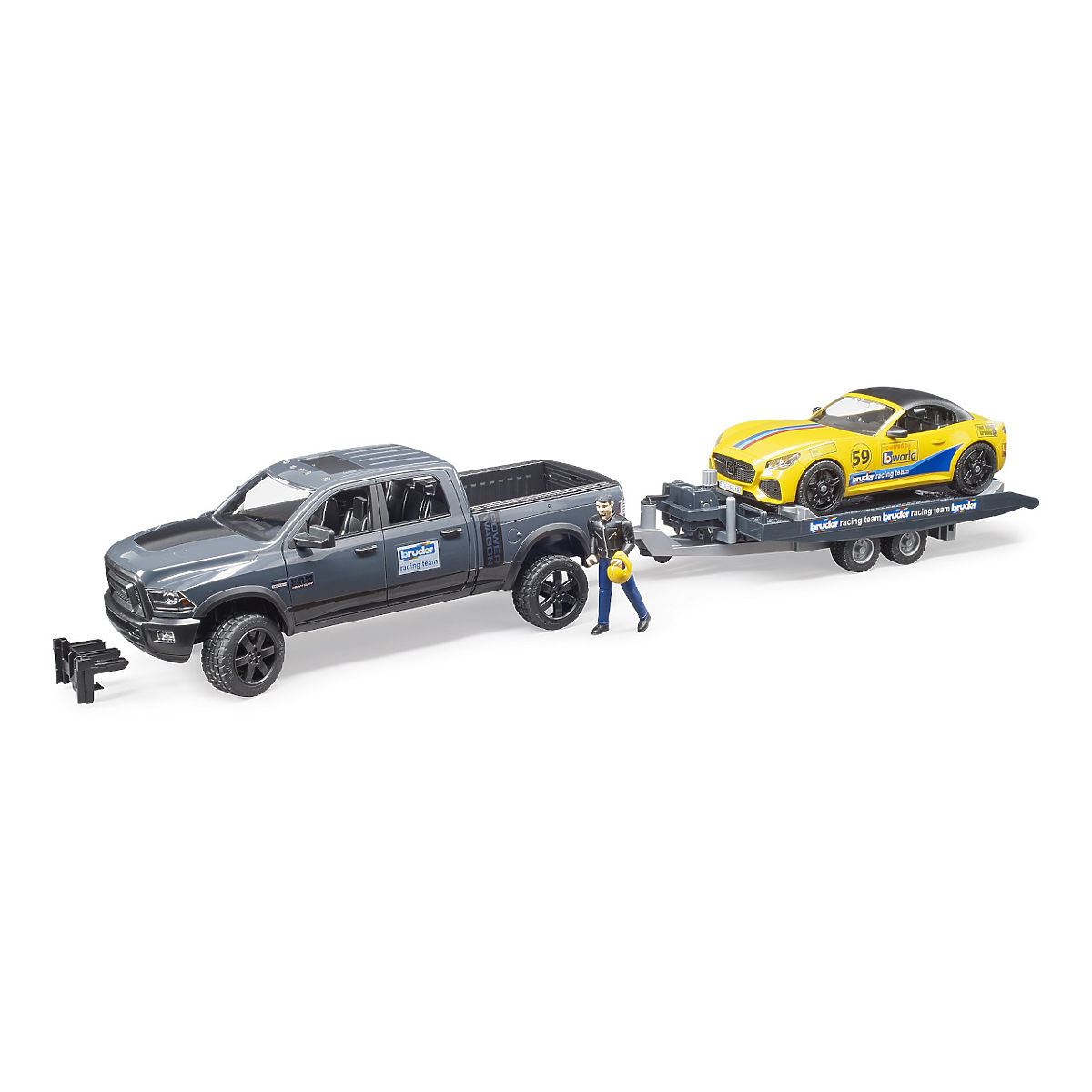 Ein interessantes Entspannungserlebnis mit einer ordentlichen Portion Adrenalin könnte für Ihren Landwirt eine Fahrt im Sportwagen sein. Wie gefällt Ihnen das Modell Bruder 2504? Der praktische Geländewagen Bruder 2504 ist sicherlich für jeden nützlich, der von Zeit zu Zeit eine kleinere Ladung transportieren muss, zum Beispiel Tierfutter oder einen aufgemotzten Sportwagen. Der Bruder 02504 hat zu öffnende Türen und der Platz hinter dem Lenkrad ist für Bruder BWORLD Figuren angepasst. Das Geländewagen kann mit einem zusätzlichen Lenkrad gesteuert werden, das im Lieferumfang enthalten ist. Im Lieferumfang des Bruder 02504 ist ein gelbes Sportauto mit abnehmbarem Dach und eine Fahrerfigur enthalten. Genießen Sie mit Ihren Bruder Figuren viel Spaß in der Welt der Rennwagen. Erwerben Sie weitere BWORLD Figuren und interessantes Zubehör von Bruder zum Modell Bruder 2504 mit Auto, Sportwagen und Figur und erleben Sie noch mehr Spaß. Hauptmerkmale: zu öffnende Türen, abnehmbares Dach, Platz hinter dem Lenkrad für Bruder BWORLD Figuren angepasst, Möglichkeit der Steuerung mit zusätzlichem Lenkrad, im Lieferumfang enthalten sind Geländewagen und Figur, für mehr Spaß können Figuren und diverses Zubehör hinzugekauft werden.