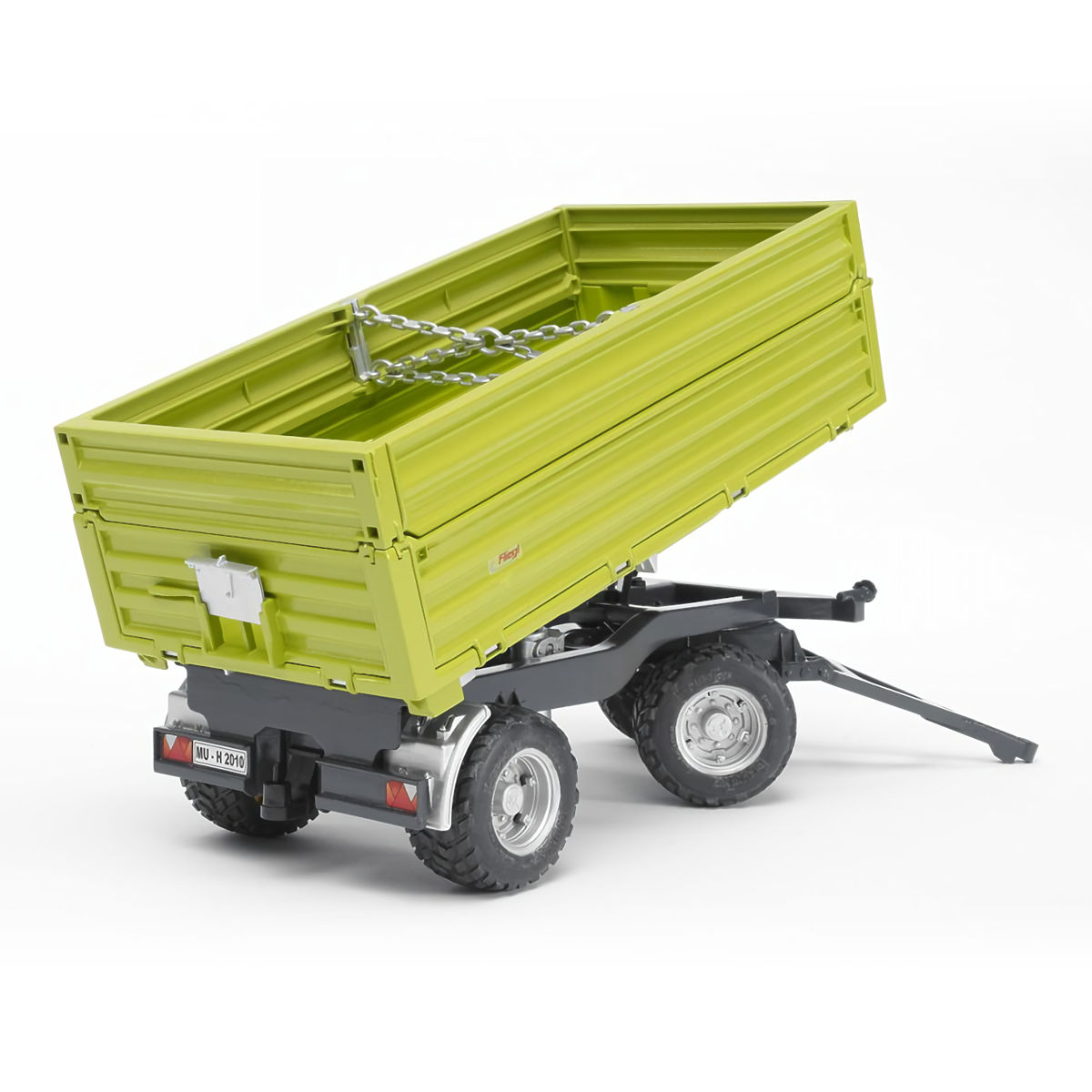 Der Bruder Kippanhänger Fliegl mit Aufsätzen ist ein grüner, dreiseitig ausgeklügelter variabler Anhänger, der für Traktoren der Serie 3000 bestimmt ist. Mit dem Bedienelement an der Vorderseite des Anhängers über der Anhängevorrichtung können Sie die Kipp-Richtung der Ladeplattform steuern. Die Position "Mitte" kippt klassisch nach hinten; die Position "links" kippt zur linken Seite; die Position "rechts" kippt zur rechten Seite. Beim Kippen nach links oder rechts kann die Seitenwand durch Verschieben des Hebels in Fahrtrichtung geöffnet werden. Der Anhänger verfügt über eine eigene Anhängevorrichtung, die es ermöglicht, einen weiteren Anhänger anzuhängen und so ein wirklich bemerkenswertes Gespann aus zwei oder mehr Anhängern zu bilden, die von einem Traktor gezogen werden. Der Anhänger hat weiche profilierte Reifen. Die erhöhten Seitenwände sind abnehmbar. Hergestellt in Deutschland, aus hochwertigen Materialien. Hauptmerkmale: kippbarer Laderaum, öffnende Seitenwände, Anhängevorrichtung, weiche profilierte Reifen, hergestellt in Deutschland.