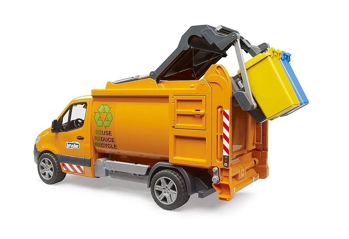 Effizient und zuverlässig, so beschreibt Mercedes Benz den neuen Sprinter, der nun die Reihe der Müllfahrzeuge von Bruder erweitert. Es gibt viele Orte, an die ein großes Müllauto nicht gelangen kann, aber mit dieser Neuheit bleibt kein Ort mehr ohne Müllabfuhr. Genau wie ein echtes Müllfahrzeug bewältigt auch dieses Modell des städtischen Müllwagens kleine Mülltonnen oder Container sowie Abfallbehälter. Für Müllsäcke und vergessenen Abfall gibt es zwei seitliche Klappen. Zum Entleeren der Mülltonnen oder Container öffnet sich die Dachklappe des Fahrzeugs automatisch beim Anheben der Mülltonnen zum Entleeren. Nach dem Entleeren und Absenken der Mülltonnen schließt sich die Klappe wieder. Das Fahrzeug wird durch Entriegeln und Öffnen der hinteren Klapptüren und Kippen der Fahrzeugkarosserie entleert. Hauptmerkmale: öffnende Türen, Fenster aus transparentem und gehärtetem Kunststoff, kippbare Karosserie, Profilreifen, 2 Mülltonnen, hergestellt aus hochwertigem ABS-Kunststoff, kompatibel mit BWORLD-Figuren, hergestellt in Deutschland