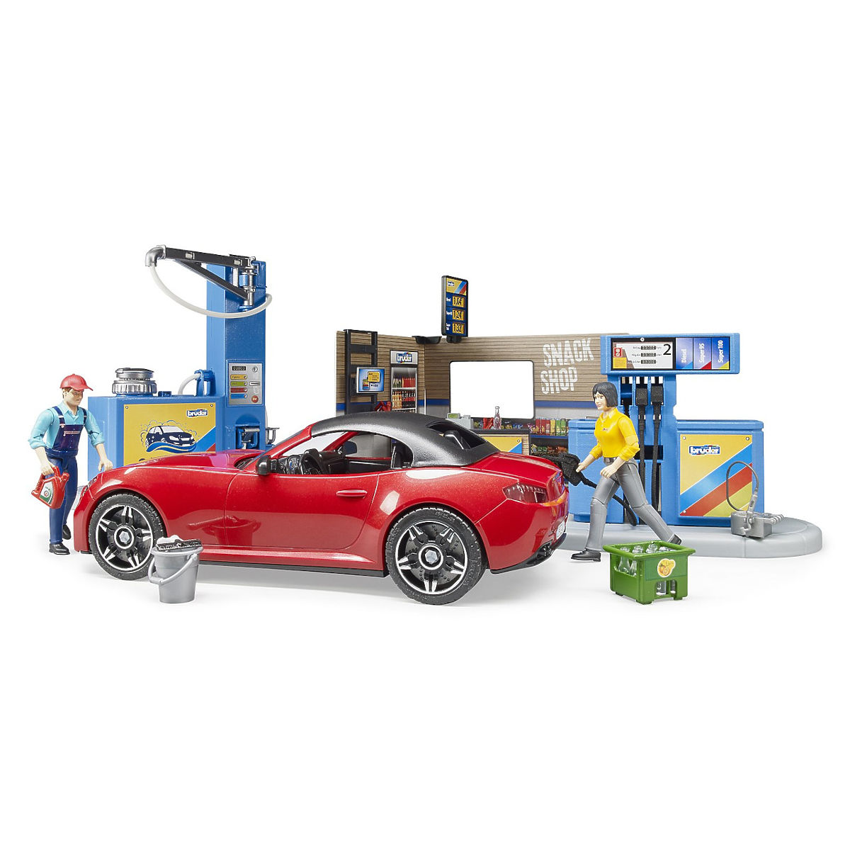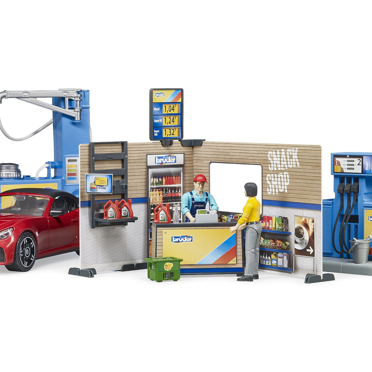 Jedes Bruder-Auto braucht schließlich einen Ort zum Tanken oder Aufladen. Und nicht nur das, der Fahrer möchte sich auch erfrischen und die Möglichkeit nutzen, sein Auto zu waschen. Dabei ist ein freundlicher, professioneller Service sicherlich willkommen. Mit dem Modell der Tankstelle stehen all diese Möglichkeiten zur Verfügung. Die Waschanlage ist voll funktionsfähig, es reicht, Wasser in den Behälter zu füllen und den Knopf zu drücken! Die Kulissen der Station sind detailliert beidseitig bedruckt und mit funktionalen Details, einem Regal mit Kanistern und einer Preisliste ausgestattet. Zum Set gehört auch weiteres kleines Zubehör, eine Kiste, ein Dampfreiniger und ein Eimer mit Fensterwischer. Das variable Sportauto hat abnehmbare Räder und ein Dach und ist natürlich mit den Bruder BWORLD-Figuren kompatibel. Hergestellt in Deutschland, aus hochwertigen Materialien. Hauptmerkmale: Pumpe, Waschanlage, Station, Auto und 2 Figuren 2 beidseitig bedruckte Wände der Station mit Werbeschild, Regalteil und Kassentheke 3 Kanister, Eimer mit Fensterwischer, Dampfreiniger und Kiste mit Flaschen Die Waschanlage ist funktionsfähig, kann mit Wasser gefüllt werden Abnehmbare Räder und Dach des Autos Kompatibilität mit BWORLD-Zubehör Hergestellt in Deutschland