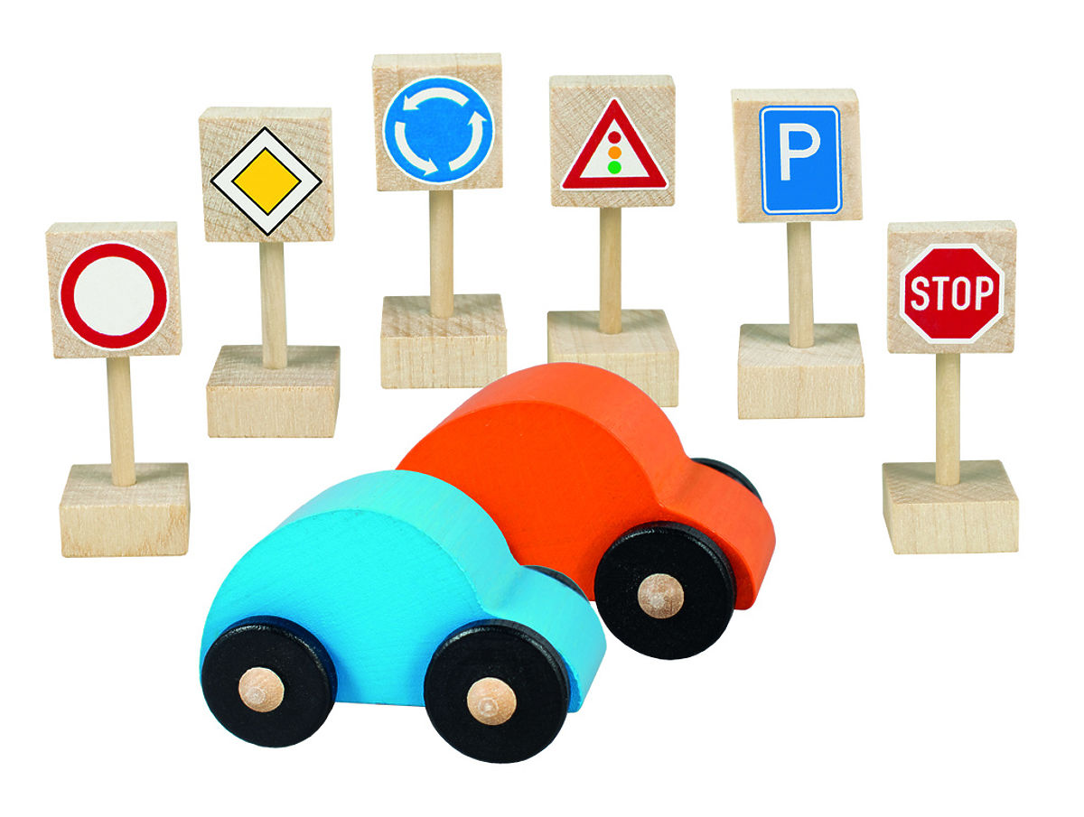 Enthält: 2 Holzautos, 6 Verkehrsschilder