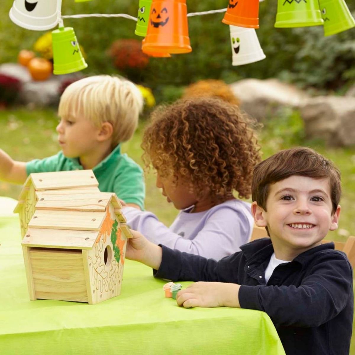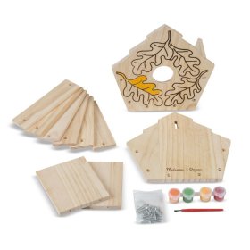 Im Bausatz sind Farben enthalten, mit denen Sie den Stand vor oder nach dem Aufbau dekorieren können. Auf der Vorderseite befindet sich ein fertiges Muster aus Blättern zum Ausmalen. Das Kind kann das Vogelhaus nach seinen Vorstellungen dekorieren, sodass jedes Vogelhaus originell und einzigartig ist.