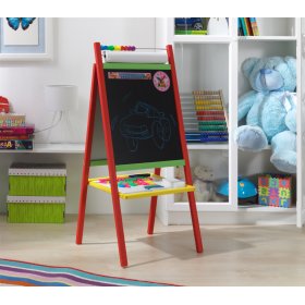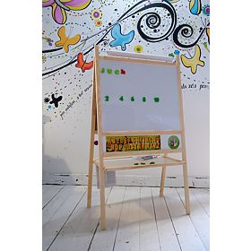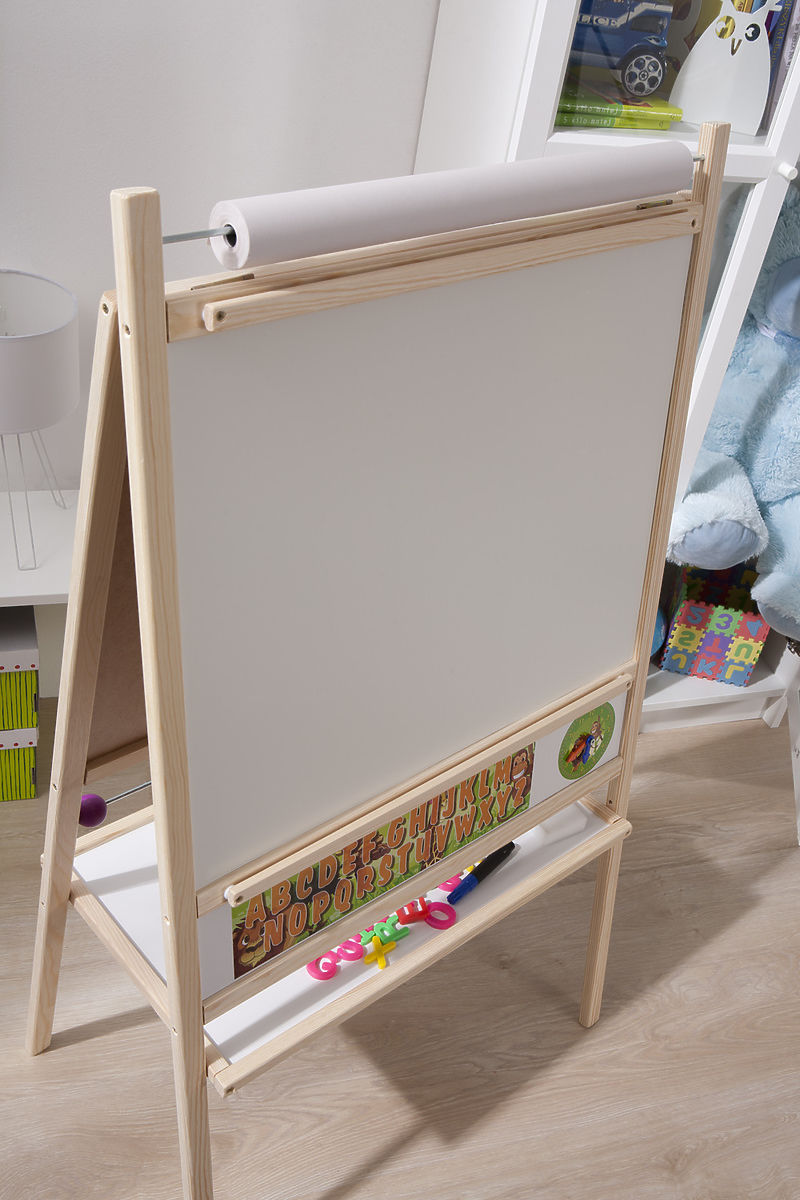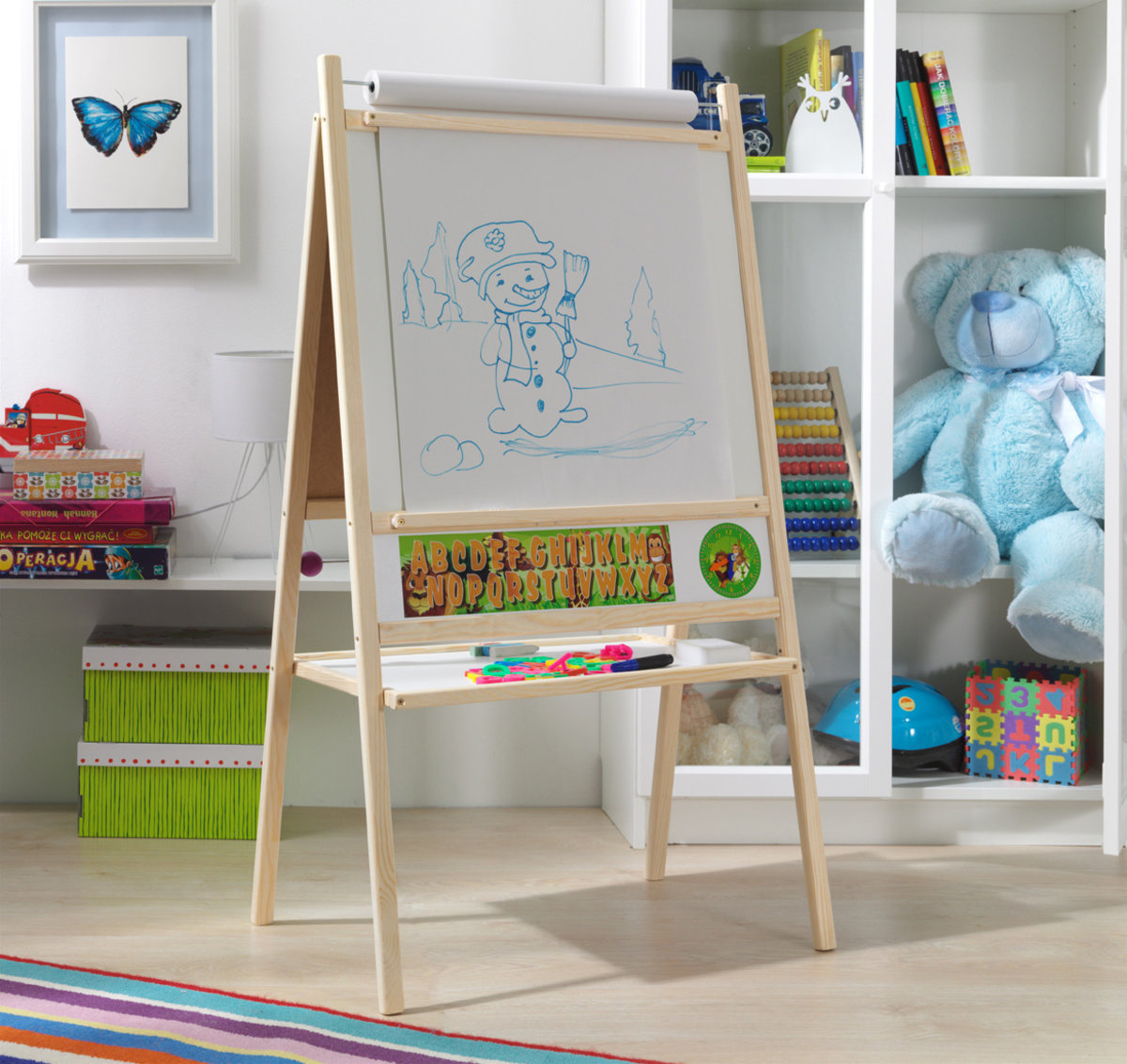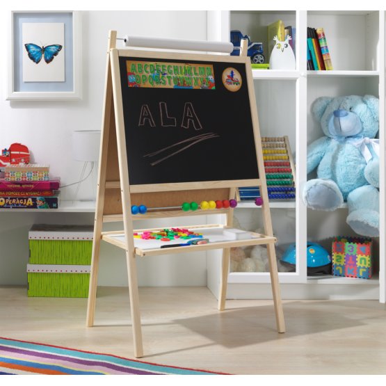 Eine Tafel mit natürlichem Rahmen eignet sich für jedes Kinderzimmer. Es ist nicht nur ein perfektes Kinderspielzeug, sondern auch ein großartiges Werkzeug zum Unterrichten und Entwickeln eines Kindes. Durch die Verwendung des 4-in-1-Boards können Sie nicht nur Schreiben, Zählen oder Lesen, sondern auch kreatives Denken entwickeln. Unter der Schreibfläche finden Sie einen einfachen farbigen Taschenrechner, einen Zähler zum Platzieren von Kreiden und Markern.