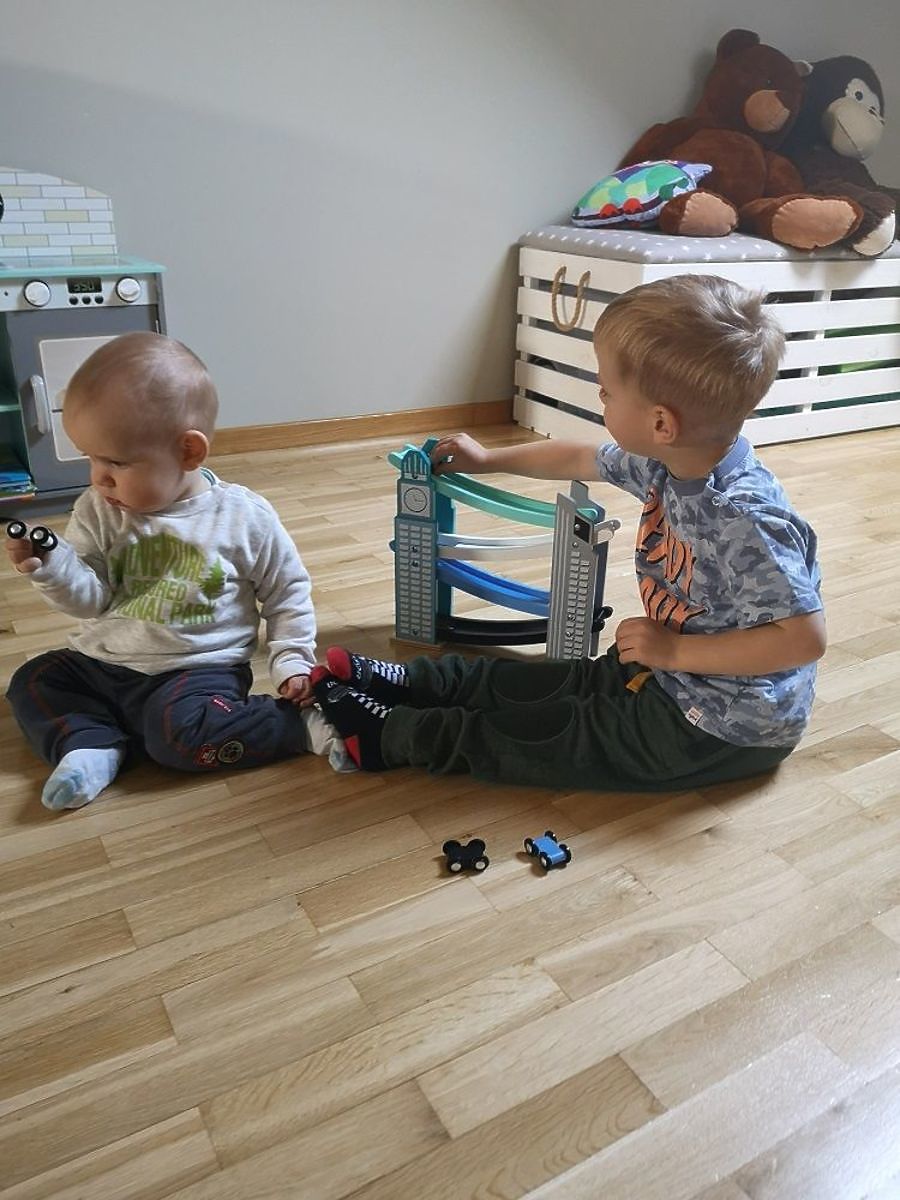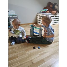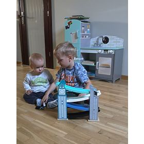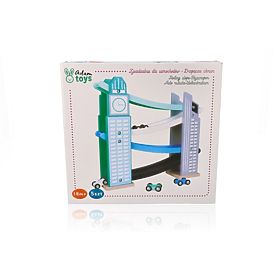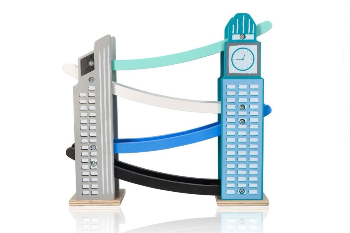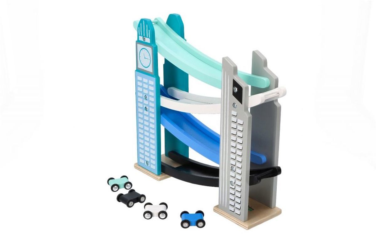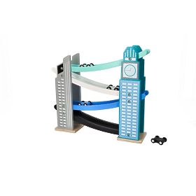 Mit der Holzrutsche zum Thema Wolkenkratzer werden Sie viel Spaß haben. Das Spielzeug besteht aus 4 Etagen mit kaskadierenden Rutschen. Platzieren Sie das Spielzeugauto oben auf der Strecke und beobachten Sie, wie es die einzelnen Stockwerke hinunterfährt, bis es das Ziel erreicht.