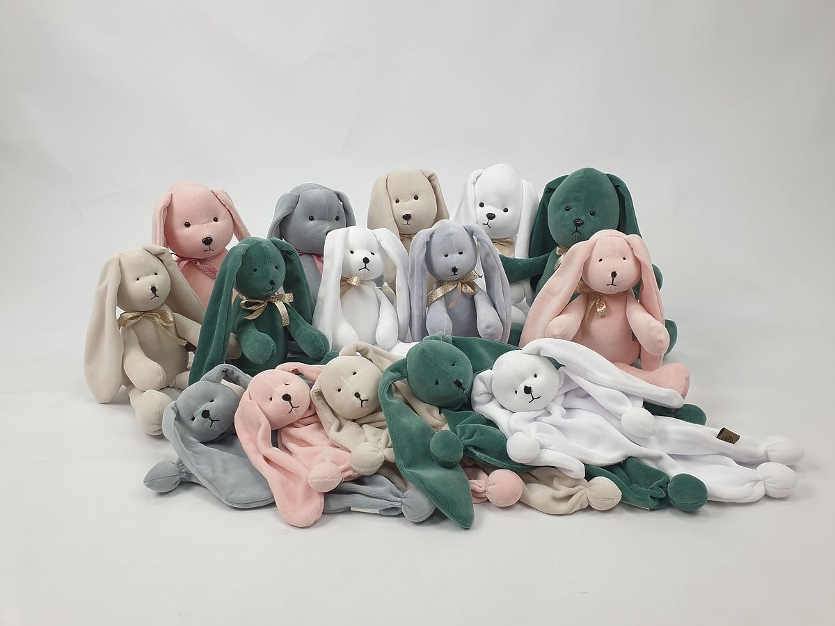 Plüsch-Maskottchen in Form eines grauen Kaninchens, das aus Velours gefertigt ist und sich angenehm anfühlt. Der perfekte Begleiter zum Schlafen, Reisen und Spielen ab den ersten Lebenstagen. Schön verpackt kann es eine tolle Geschenkidee sein, die jedem Baby gefallen wird.