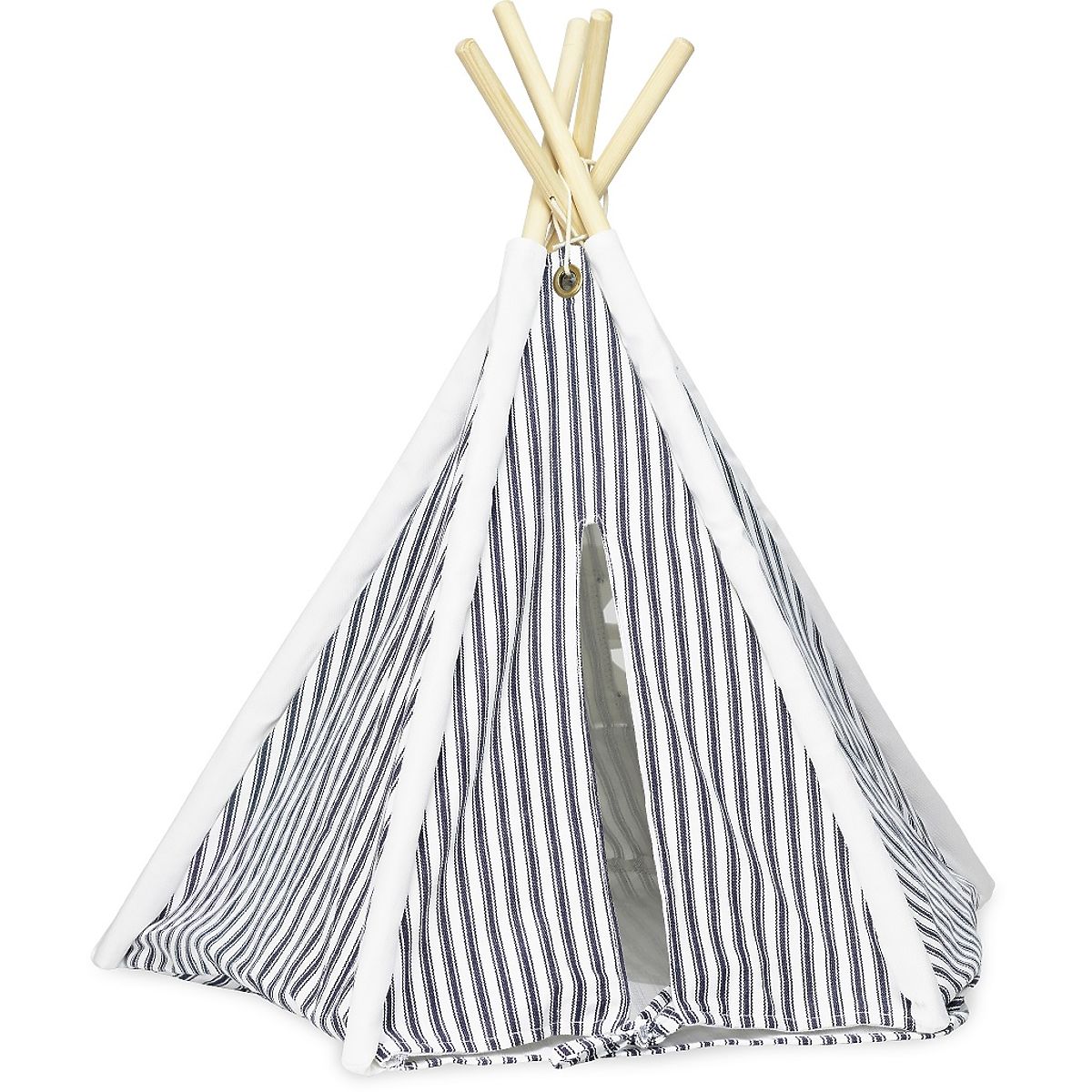 Schönes gestreiftes Mini-Tipi, ideal für Puppen. Der Holzrahmen mit textilem Überwurf ist einfach zu montieren. Der Stoff ist dunkelgrau und weiß. Hauptmerkmale: Tipi für Puppen, stabile Konstruktion