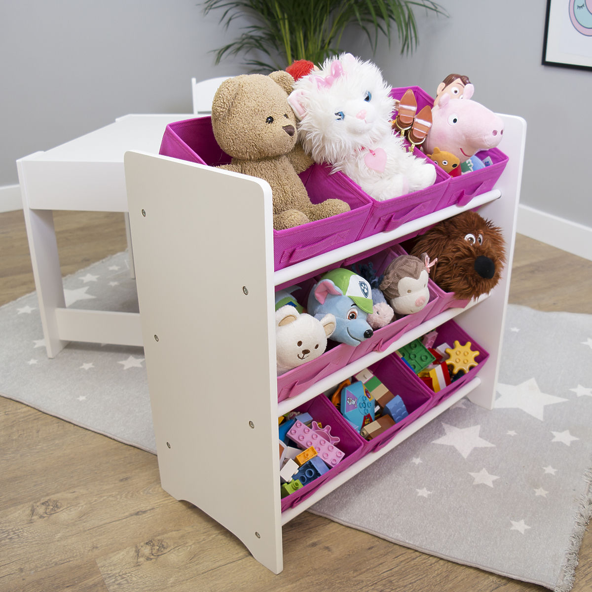 Der schöne OURBABY Spielzeug-Organizer in weißem Design mit rosa Boxen passt perfekt in jedes Kinderzimmer.