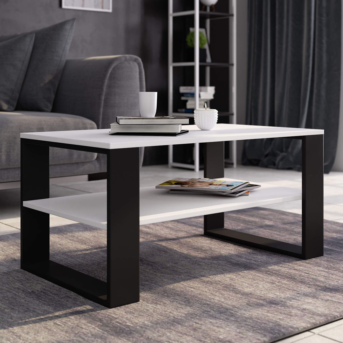 Der weiße Couchtisch Alex mit schwarzen Beinen kombiniert ein attraktives und ästhetisches Erscheinungsbild mit Funktionalität und Vielseitigkeit. Dank der weißen Farbe passt der Tisch hervorragend in moderne und traditionelle Innenräume und vergrößert und erhellt den Raum optisch. Die kleine Größe des Möbels stellt sicher, dass der Tisch auch in einem kleinen Raum in einer Wohnung seinen Zweck erfüllt. Der Tisch ist ein Möbelstück mit vielseitiger Bestimmung. Er kann nicht nur zum Kaffeetrinken, Teetrinken oder für kalte Getränke, zum Empfang von Gästen oder zur täglichen Entspannung genutzt werden. Der Tisch mit funktionaler Platte eignet sich auch für die Arbeit mit einem Laptop, während das breite Regal unten Platz für Computerzubehör und Arbeitsmaterialien bietet. Der weiße Couchtisch Alex mit schwarzen Beinen besteht aus einer abrieb- und wasserfesten laminierten Platte, wodurch die Tischplatte auch nass gereinigt werden kann. Die Kanten des Tisches wurden mit robusten ABS-Kanten versehen, was die Widerstandsfähigkeit des Möbels gegen Beschädigungen weiter erhöht.