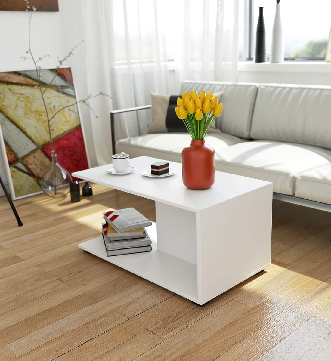Der weiße Couchtisch ist eine gelungene Verbindung von Funktionalität und visueller Attraktivität. Das Möbelstück passt sowohl in ein klassisch als auch modern eingerichtetes Wohnzimmer. Der 90 cm Couchtisch ist aus einer hochwertigen laminierten Platte gefertigt, die abriebfest ist. Der Tisch kann häufig feucht gereinigt werden, ohne dass seine Platte beschädigt wird. Die kleine Größe des Tisches sorgt dafür, dass er sowohl für kleine als auch große Wohnzimmer geeignet ist. Am Couchtisch können Sie bequem Kaffee und Tee genießen, Bücher und Zeitschriften lesen oder Ihre Freizeit mit Brettspielen verbringen. Der Wohnzimmertisch ist mit einem zusätzlichen unteren Regal in der Größe der Tischplatte ausgestattet, was seine Funktionalität erheblich erhöht. Das Regal kann für Zeitschriften oder Discs genutzt werden oder frei bleiben, um Dinge wie Handarbeiten leicht abzulegen. Der Couchtisch kann auch zu dekorativen Zwecken verwendet werden, indem eine Designlampe oder eine Blumendekoration platziert wird.
